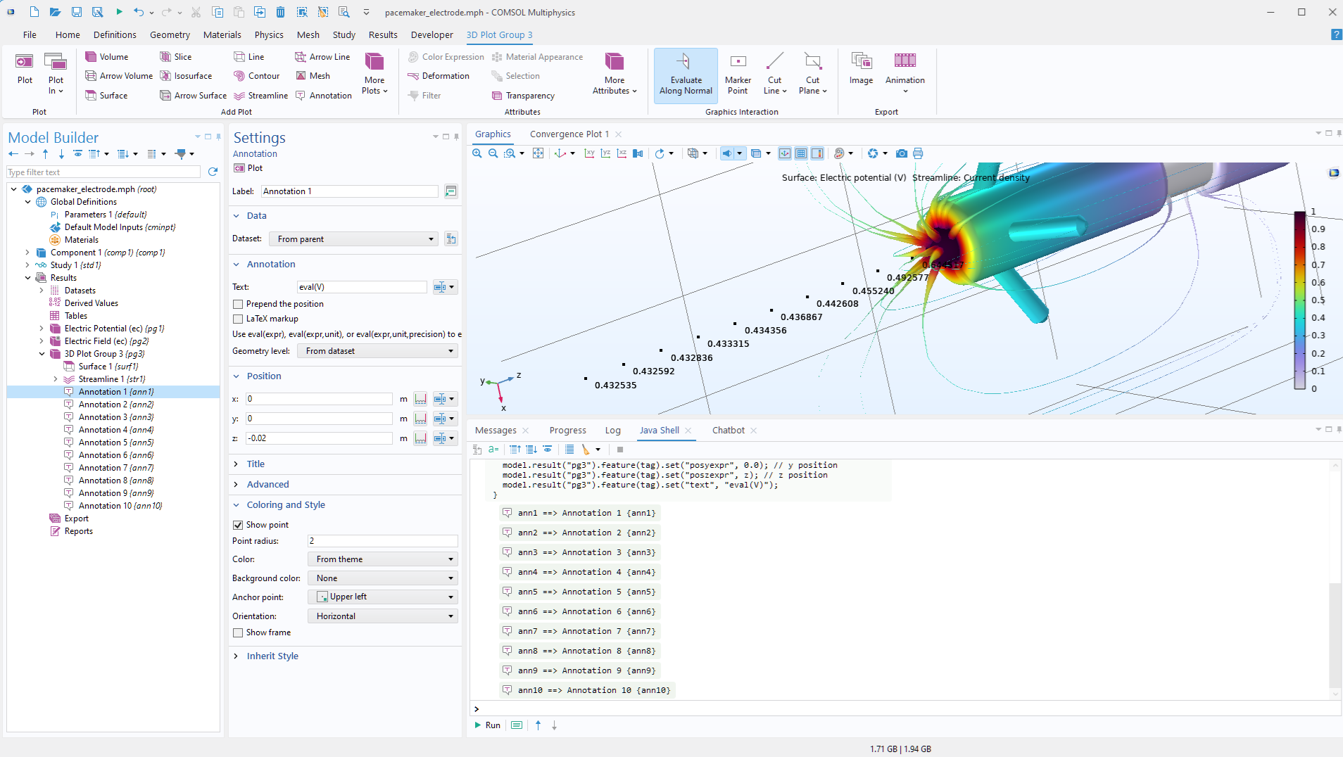 The COMSOL Multiphysics UI showing the Model Builder with the Annotation node selected, the corresponding Settings window, and a pacemaker model in the Graphics window. Now, let’s try something a bit more advanced. Start by deleting all of the generated Annotation nodes. You can do this by holding Shift to select multiple nodes, then right-clicking and choosing Delete from the context menu.