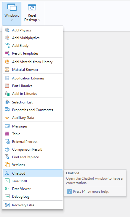 The Chatbot window is available for the Windows® version of COMSOL Multiphysics®. It is included in the platform product but is not installed by default. (Instructions on how to install and set up the Chatbot window can be found in this Learning Center article.)