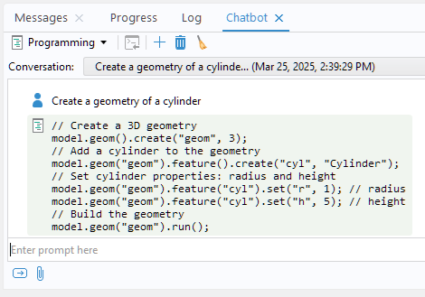 A close-up of the Chatbot window with its prompt set to Create a geometry of a cylinder. This will generate code for creating a cylinder of some arbitrary radius and height, but it will not run the code. To run the code, you need to send it to the Java Shell window.