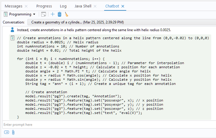 A close-up the prompt in the Chatbot window, set to Instead, create annotations in a helix pattern centered along the same line with helix radius 0.0025. Click the Submit button or press Enter.